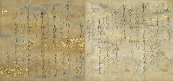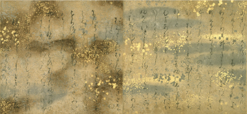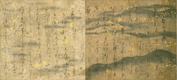 『源氏物語』第40帖「御法」。光源氏の最愛の妻である紫上が重病にふし、源氏と明石中宮(光源氏と明石上の娘/紫上が養育)に最後の別れを告げる場面。命のはかなさを、庭に咲く萩に付いた露にたとえて、3 人は和歌を詠み交わす。やがて、紫上の病状はにわかに悪化し、源氏に別れを告げると、横になって間もなく、明石中宮に手を取られながら静かに息を引き取った。風に吹きすさぶ萩や薄・桔梗・女郎花など秋草の繊細な描写が、3人の詠歌と悲しい心情を象徴する。